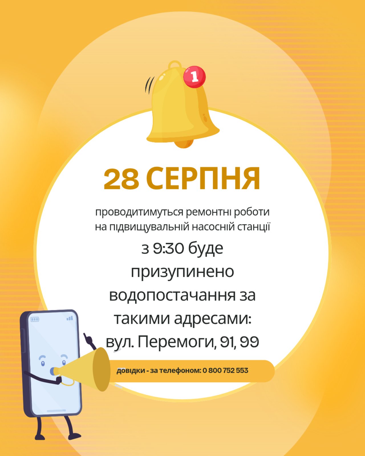 28 серпня з 9.30 на одній із підвищувальних насосних станцій міста проводитимуться роботи із заміни електрообладнання, унаслідок чого буде призупинено водопостачання за адресою: