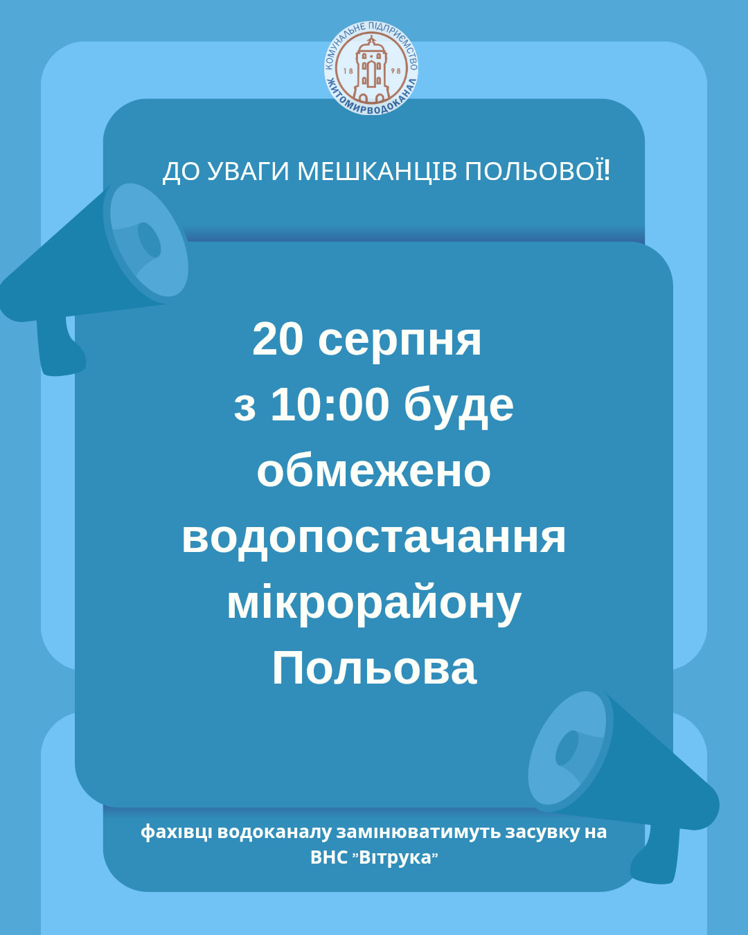 20 серпня з 10.00 для проведення робіт із заміни засувки на ВНС "Польова" буде призупинено водопостачання за такими адресами:- вул. Вітрука, 13 - 43;- пров. Шкільний, 3 - 13; - вул. Корольова, 44 - 50;- вул. Космонавтів, 2 - 26;- вул. Ціолковського, 1/1-12;- вул. Кибальчича, 1 - 10;- пл. Польова, 6, 7;- пров. Телефонний;- пров. Табірний;- пров. 3, 5-й Польовий.Просимо вибачення за незручності!