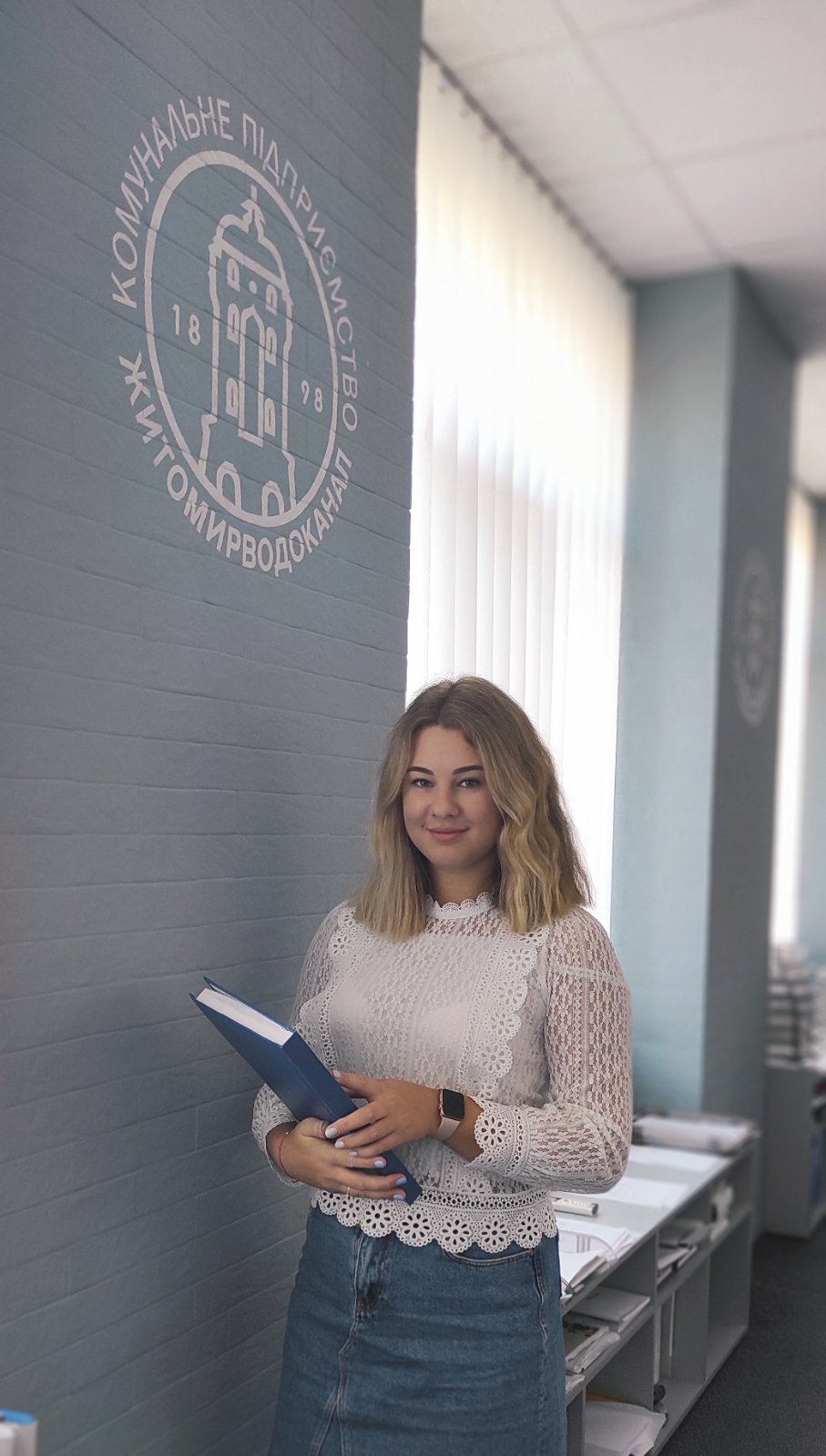 “У 2017 році я розпочала працювати на КП “Житомирводоканал”. Спочатку я була пробовідбірником в лабораторії, але через постійний контакт із холодною водою і реагентами у мене почались проблеми зі здоров’ям, тому я змушена була звільнитись. Після цього певний час працювала в Польщі на заводі. Це був важкий, але водночас цікавий досвід. Там я працювала 3 місяці, а зароблені гроші витратила на пізнання Німеччини, у якій прожила близько місяця. Найяскравіші мої враження — від надзвичайно розкішного парку Сан-Сусі, що знаходиться в Потсдамі”.