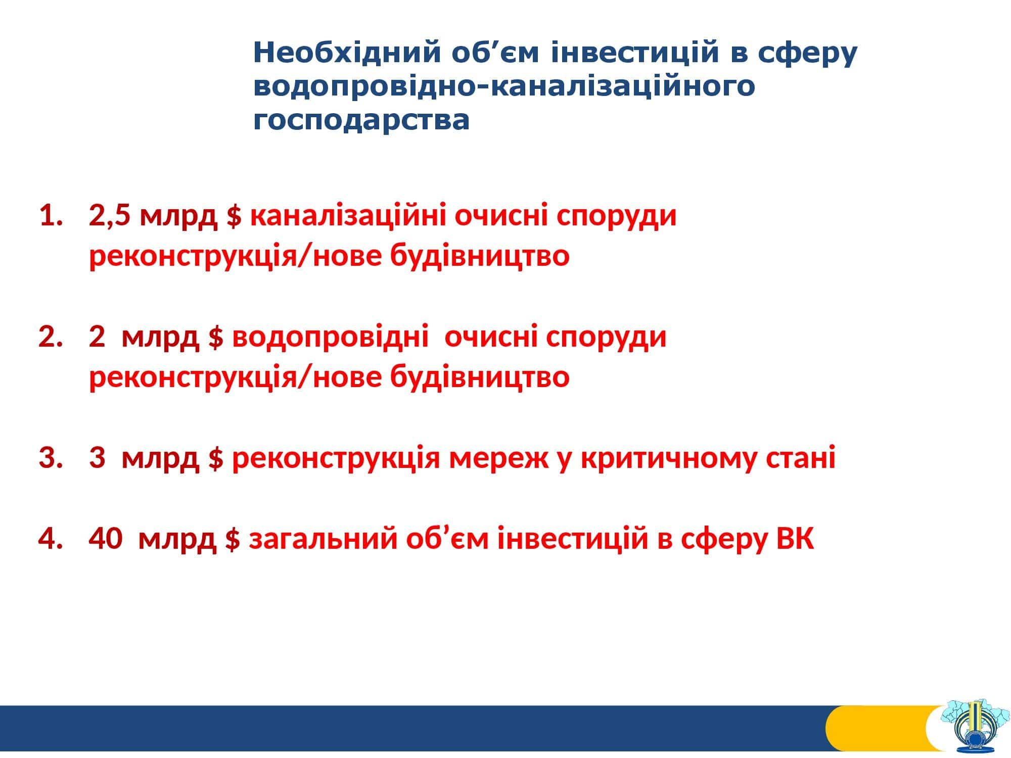“Для того, щоб досягти рівня нормальної європейської країни по послугам водопостачання та водовідведення, ми маємо отримати 40 млрд інвестицій, і терміново це 2,5 млрд — на каналізаційні очисні споруди, 2 млрд — на водопровідні очисні споруди і 3 млрд — критично необхідні на ті мережі, які щодня в нас обвалюють проїжджі частини і не дають стабільно постачати воду людям”.