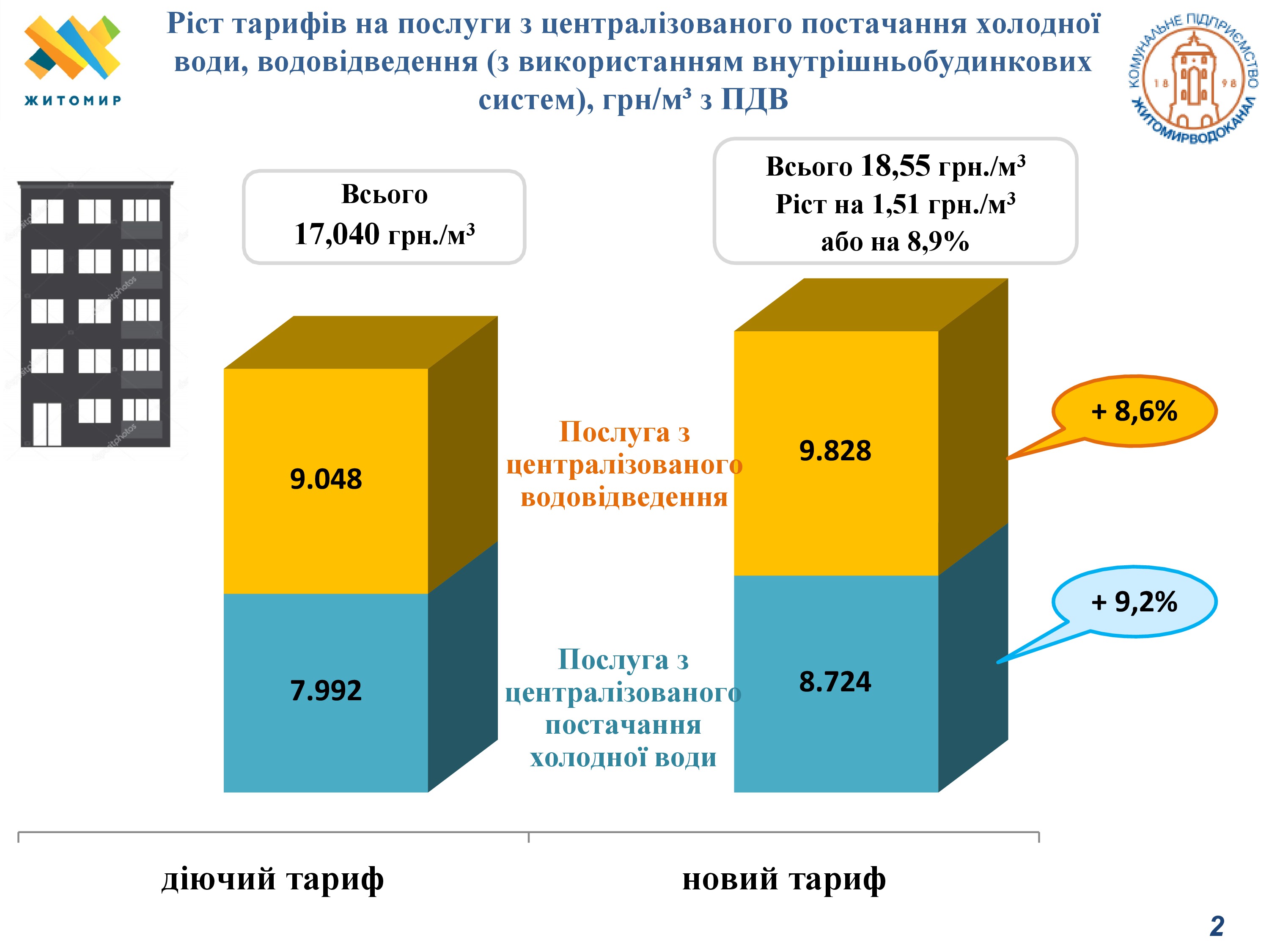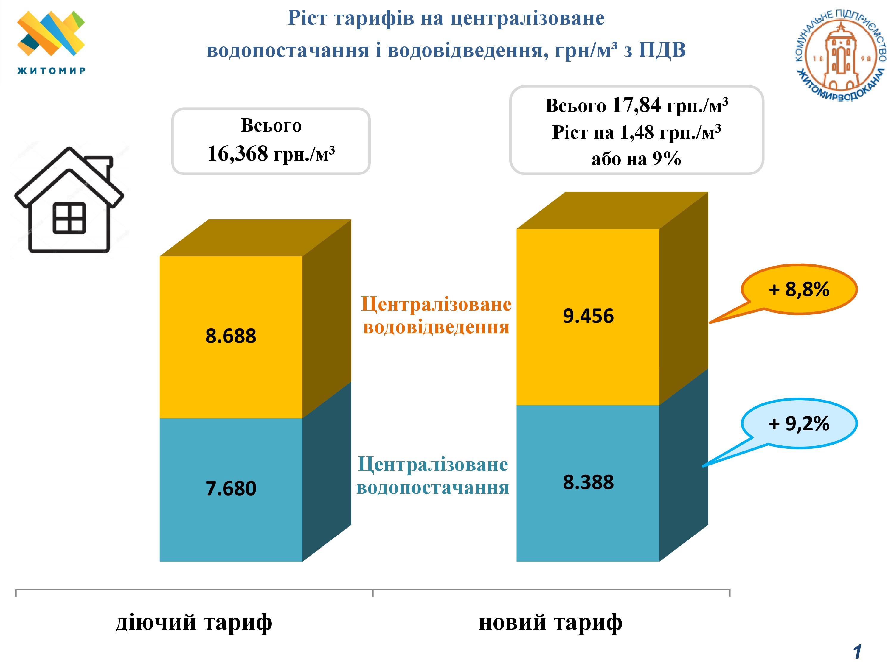 Тариф на централізоване водопостачання та водовідведення для мешканців багатоповерхівок зросте на 1,51 грн. за м3 і становитиме 18,55 грн/м3.