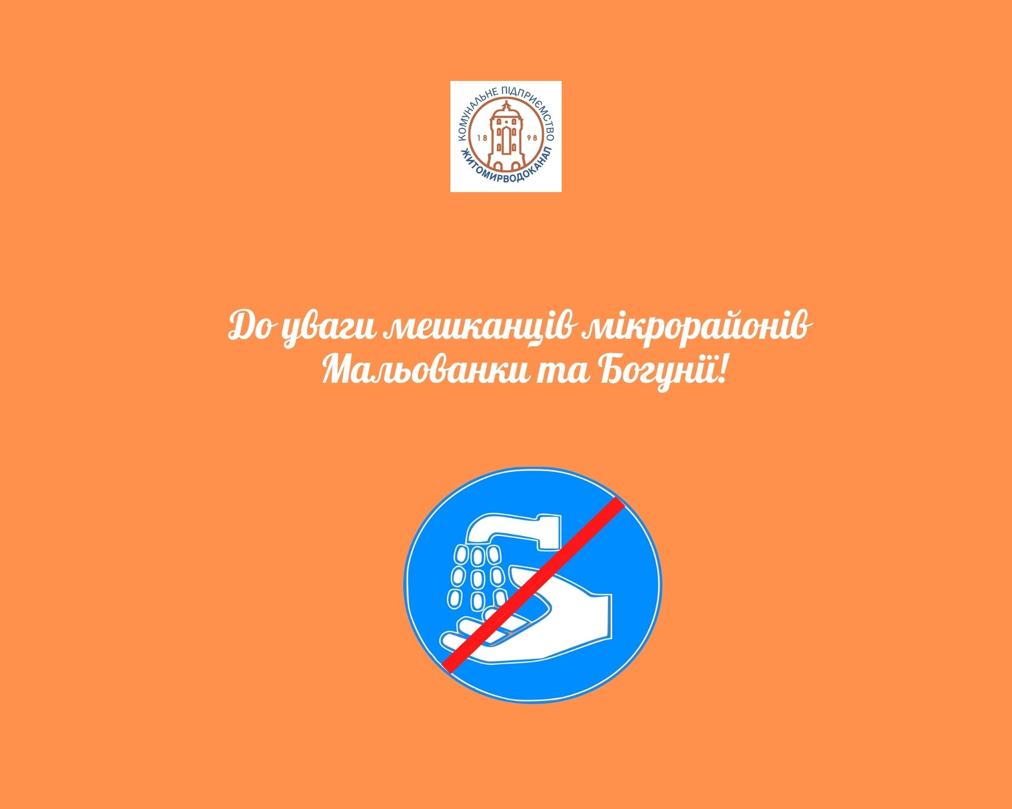 Шановні мешканці мікрорайонів Мальованки та Богунії (зокрема вул. Офіцерської, Героїв Десантників, Всеволода Петріва, Гетьмана Самойловича, частково проспекту Миру та прилеглих провулків), у зв'язку із поривом трубопроводу на вул. Кам'яний узвіз, 12 а, сьогодні з 9:30 буде призупинено водопостачання до Ваших осель. Воно буде відновлено одразу після відновлення цілісності трубопроводу.