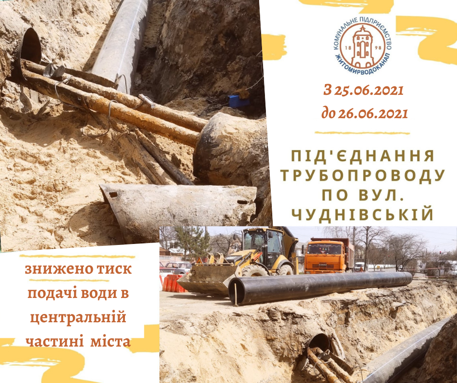 З 9:00 25 червня до 9:00 26 червня можливе зниження тиску подачі води на верхніх поверхах багатоквартирних будинків в центральній частині Житомира.