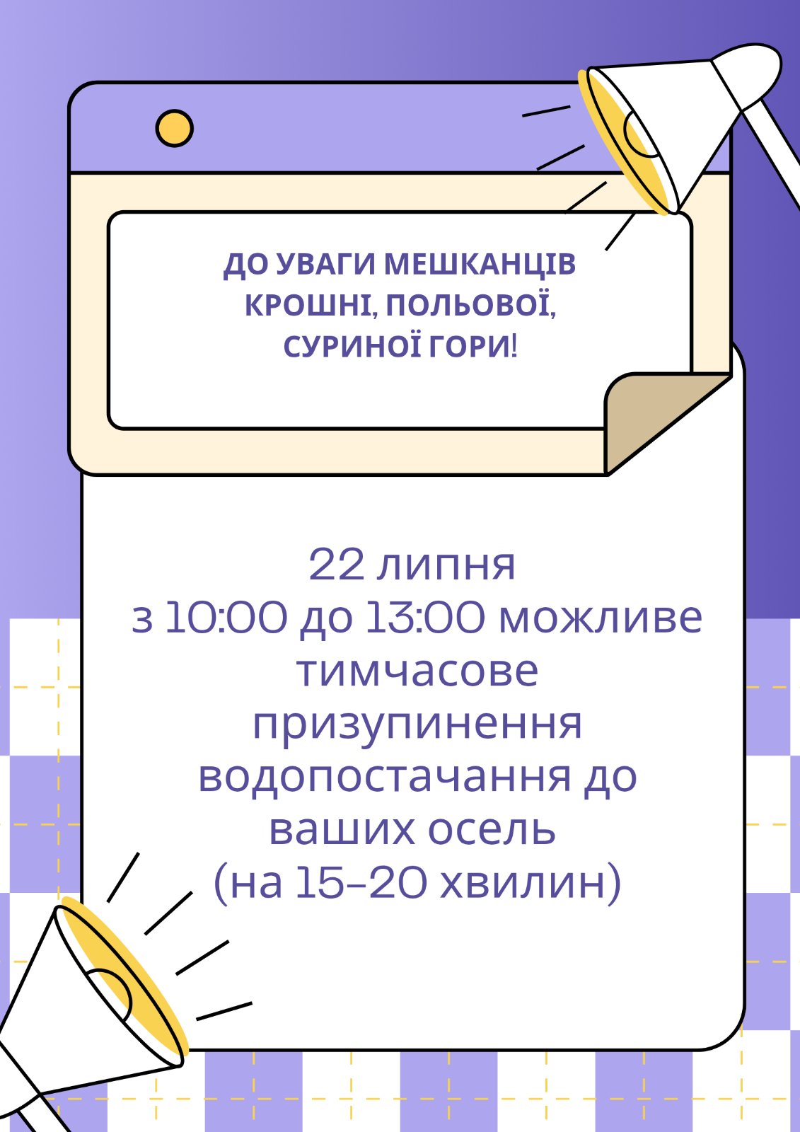 Можливе короткочасне припинення подачі води (на 15-20 хв) у мікрорайонах Сурина гора, Крошня, на Польовій.