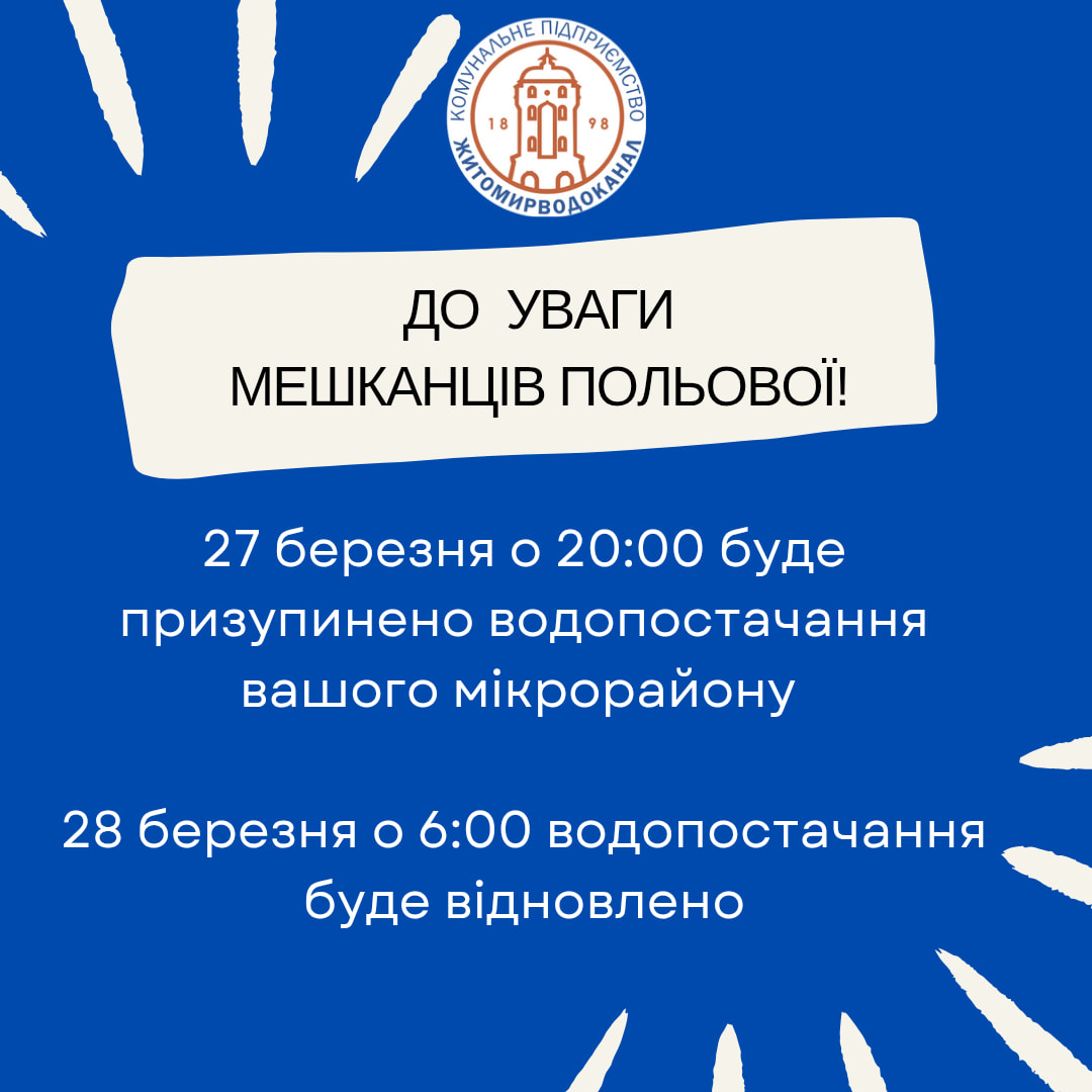 Сьогодні ввечері фахівці водоканалу продовжуватимуть ліквідовувати наслідки аварійної ситуації, унаслідок чого буде призупинено водопровідну насосну станцію "Вітрука".З 20:00 до Вашого мікрорайону буде призупинено постачання води. 28 березня о 6:00 водопостачання буде відновлено. У чому причина – дивіться у відео