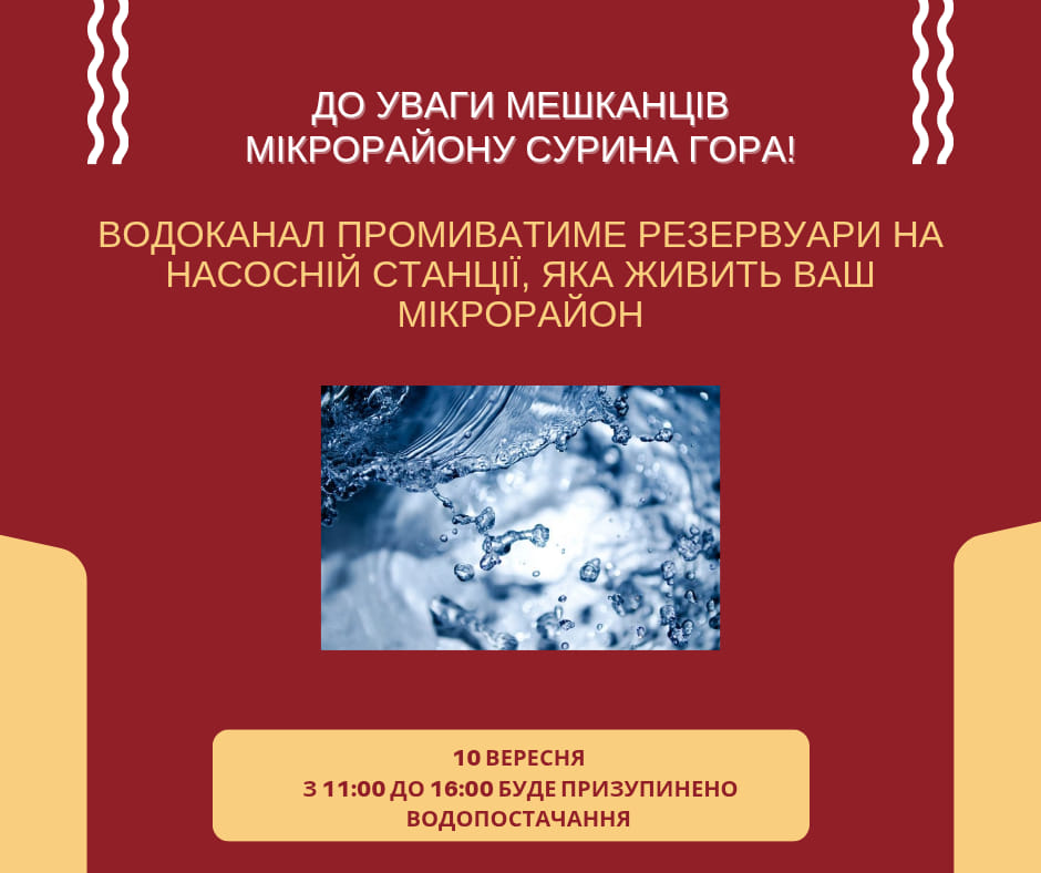 10 вересня з 11.00 до 16.00 на водопровідній насосній станції ІІІ-го підйому "Північно-Західна" здійснюватиметься промивка резервуарів питної води.