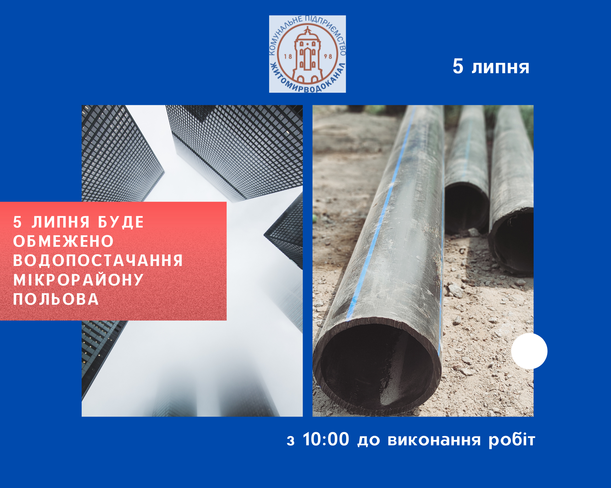 У зв'язку із проведенням робіт з 10:00 буде обмежено водопостачання мікрорайону Польова. Звертаємося із проханням до мешканців вказаного району зробити необхідний запас води.