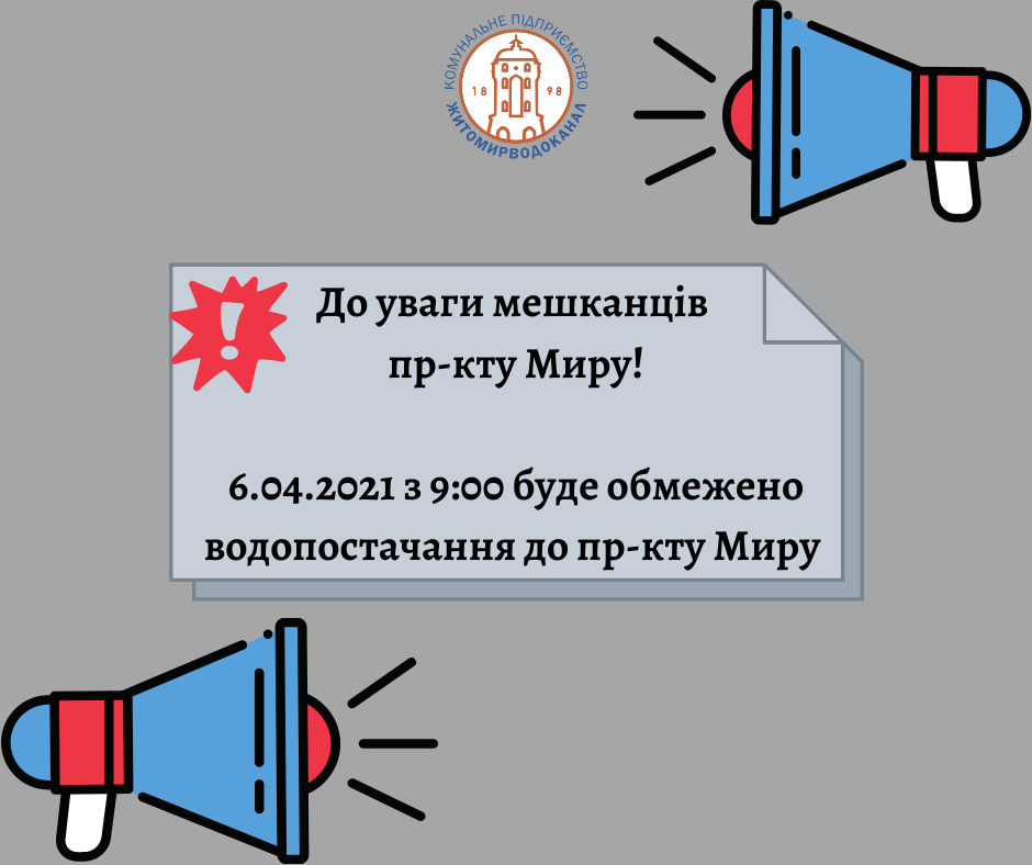 в зв'язку з проведенням робіт за адресою: пр-кт Миру, 6 буде обмежено водопостачання до вашої вулиці до виконання робіт.