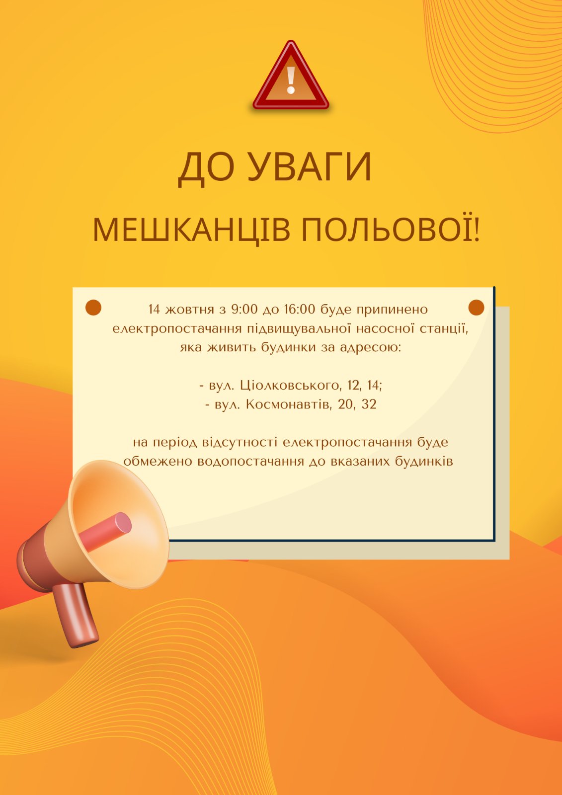 14 жовтня з 09:00 до 16:00 буде припинено електропостачання до підвищувальної насосної станції, яка забезпечує необхідним тиском подачу води до будинків за адресами: