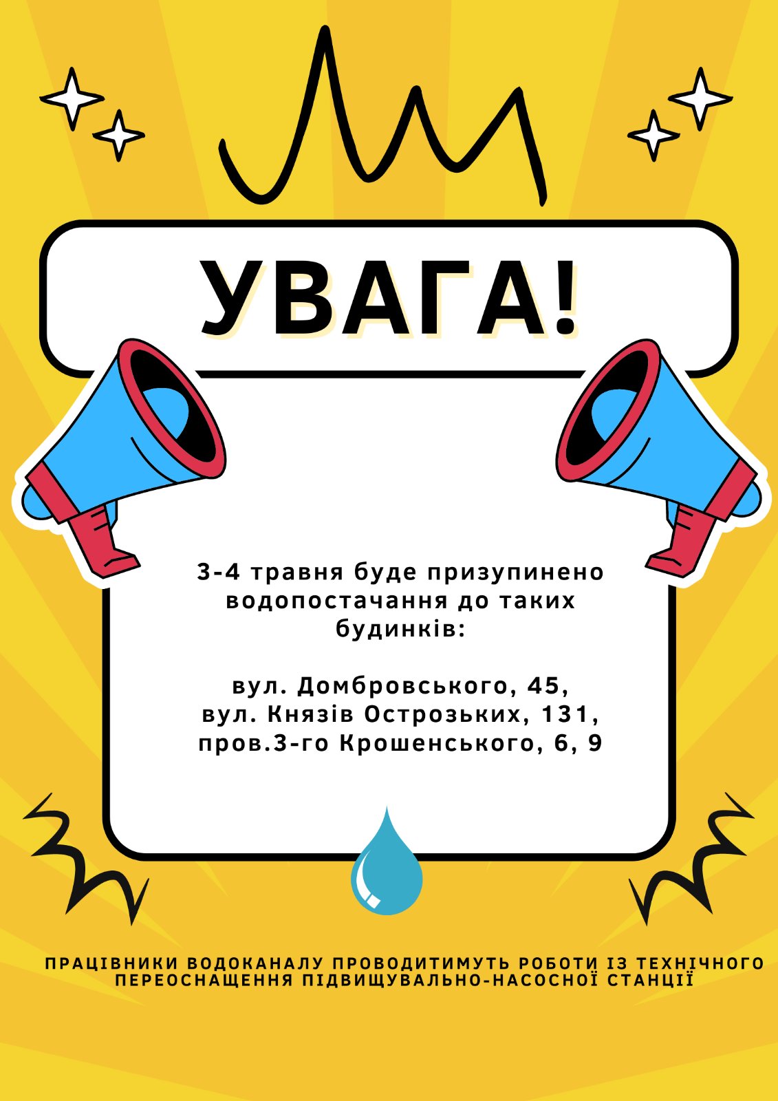 До уваги мешканців, які проживають за адресами: вул. Домбровського, 45, вул. Князів Острозьких, 131, пров. 3-го Крошенського, 6, 9!