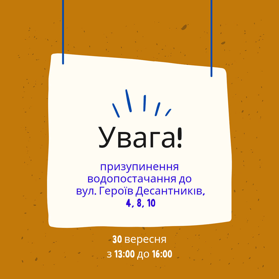30 вересня з 13:00 до 16:00 буде призупинено водопостачання до вул. Героїв Десантників, 4, 8, 10.