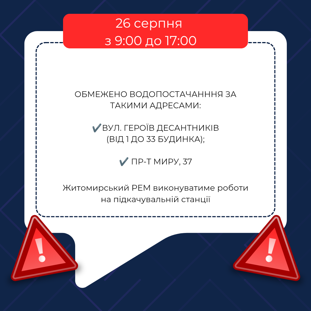 26 серпня з 09:00 до 17:00 Житомирський РЕМ проводитиме роботи на одному зі своїх об'єктів, унаслідок чого буде призупинено роботу насосної станції підвищення тиску, що зумовить обмеження водопостачання за такими адресами: