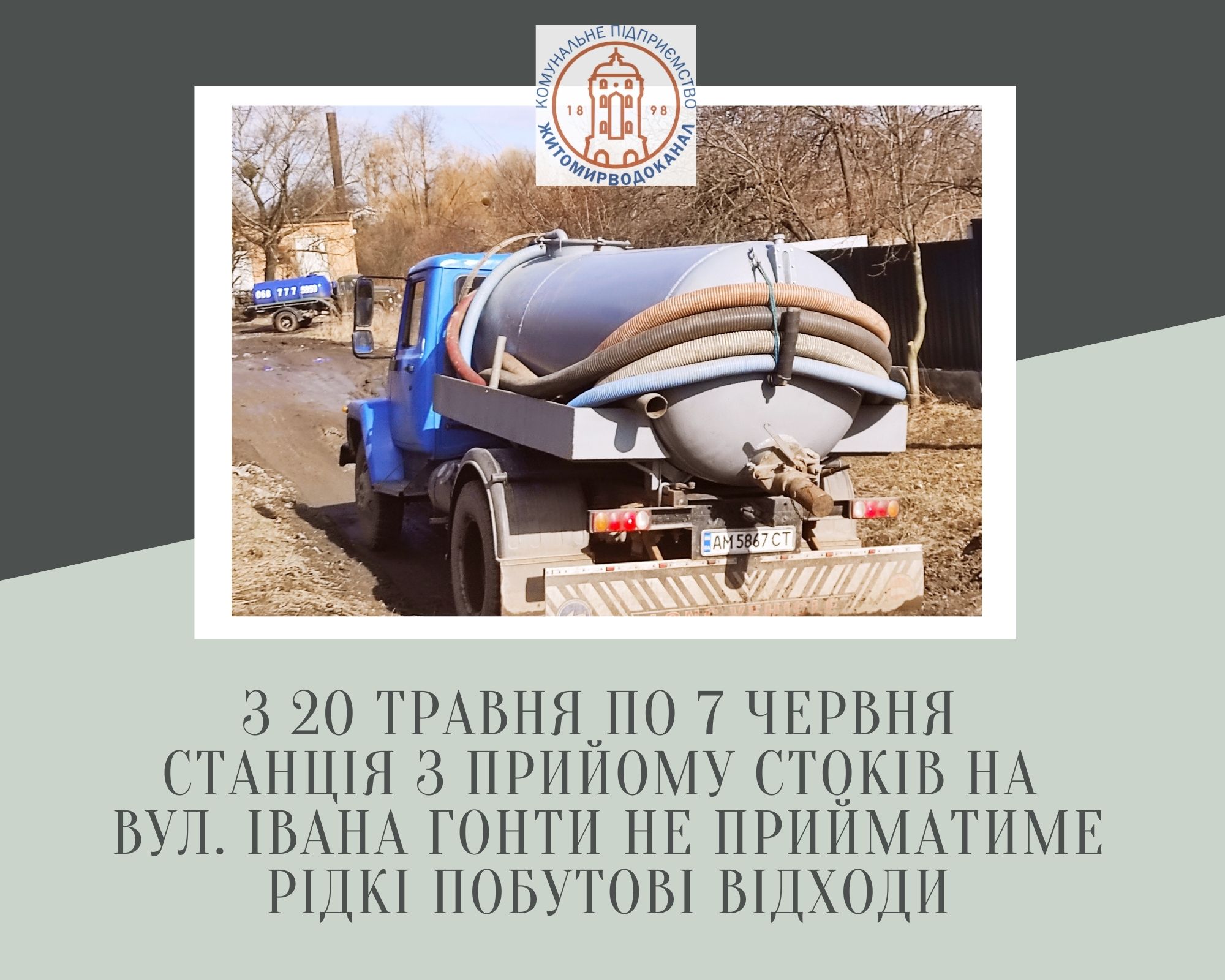 У зв'язку із виконанням робіт із заміни обладнання на головній каналізаційній насосній станції Житомира з 20 травня по 7 червня станція прийому рідких побутових відходів, яка знаходиться на вул. Івана Гонти, 16 а, буде зачинена.