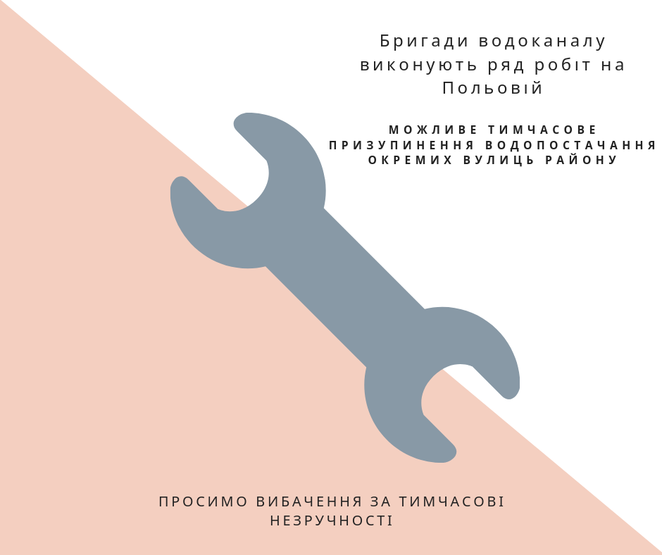 3 червня бригади водоканалу виконують роботи із заміни засувок на перекладання трубопроводу на Польовій. У зв"язку із їх проведенням на певний час буде призупинено водопостачання до деяких вулиць відповідного району.