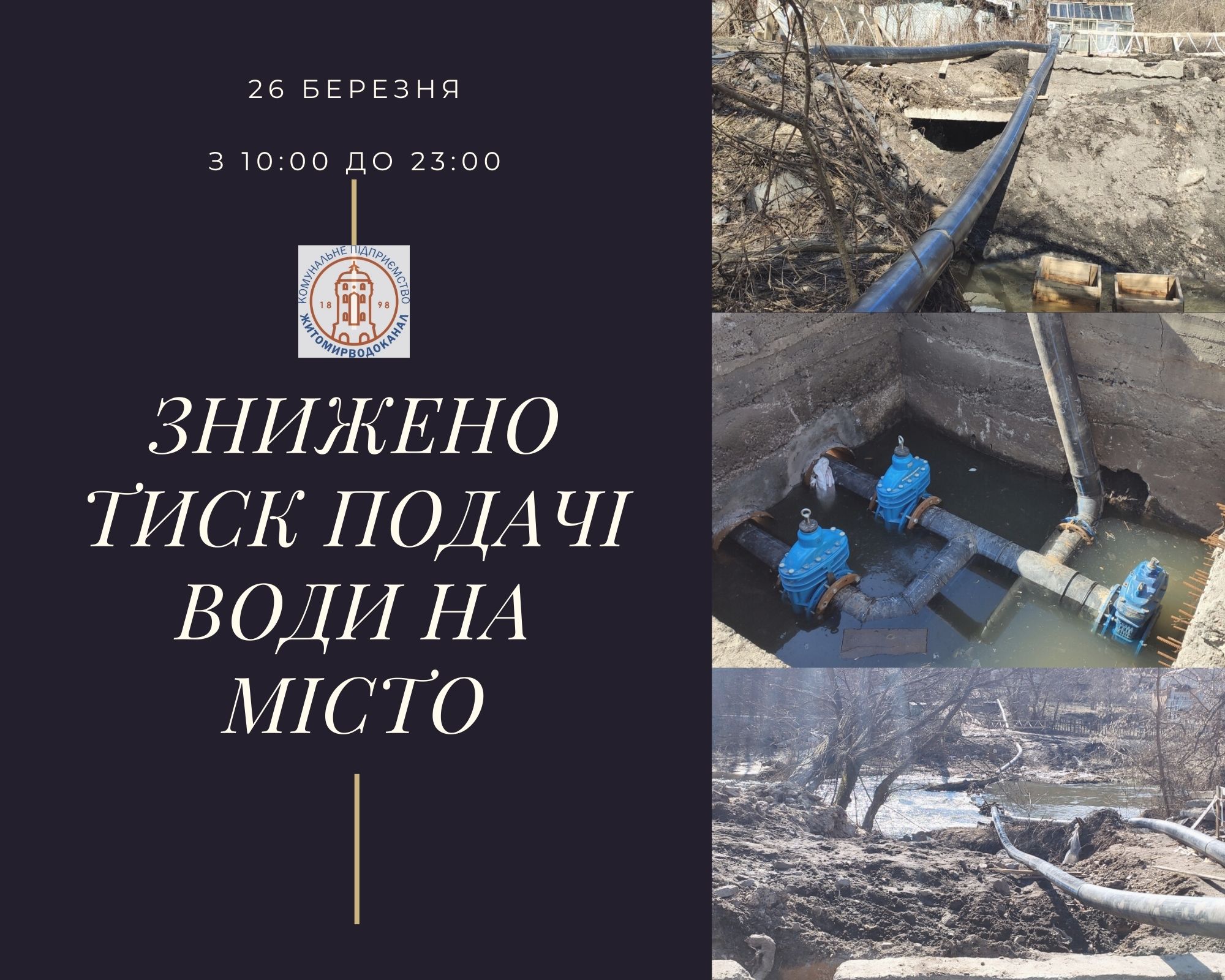 Шановні абоненти, 26 березня з 10:00 до 23:00 у зв'язку із проведенням монтажних робіт на дюкерному переході, що пролягає по вул. Троянівській, буде знижено тиск подачі в системі.