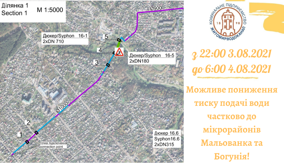 В зв’язку з проведенням підрядною організацією “КСМ-ГРУП” робіт на дюкерному переході, з 22:00 03.08.2021 до 6:00 04.08.2021 можливе пониження тиску подачі води частково до мікрорайонів Мальованка та Богунія!