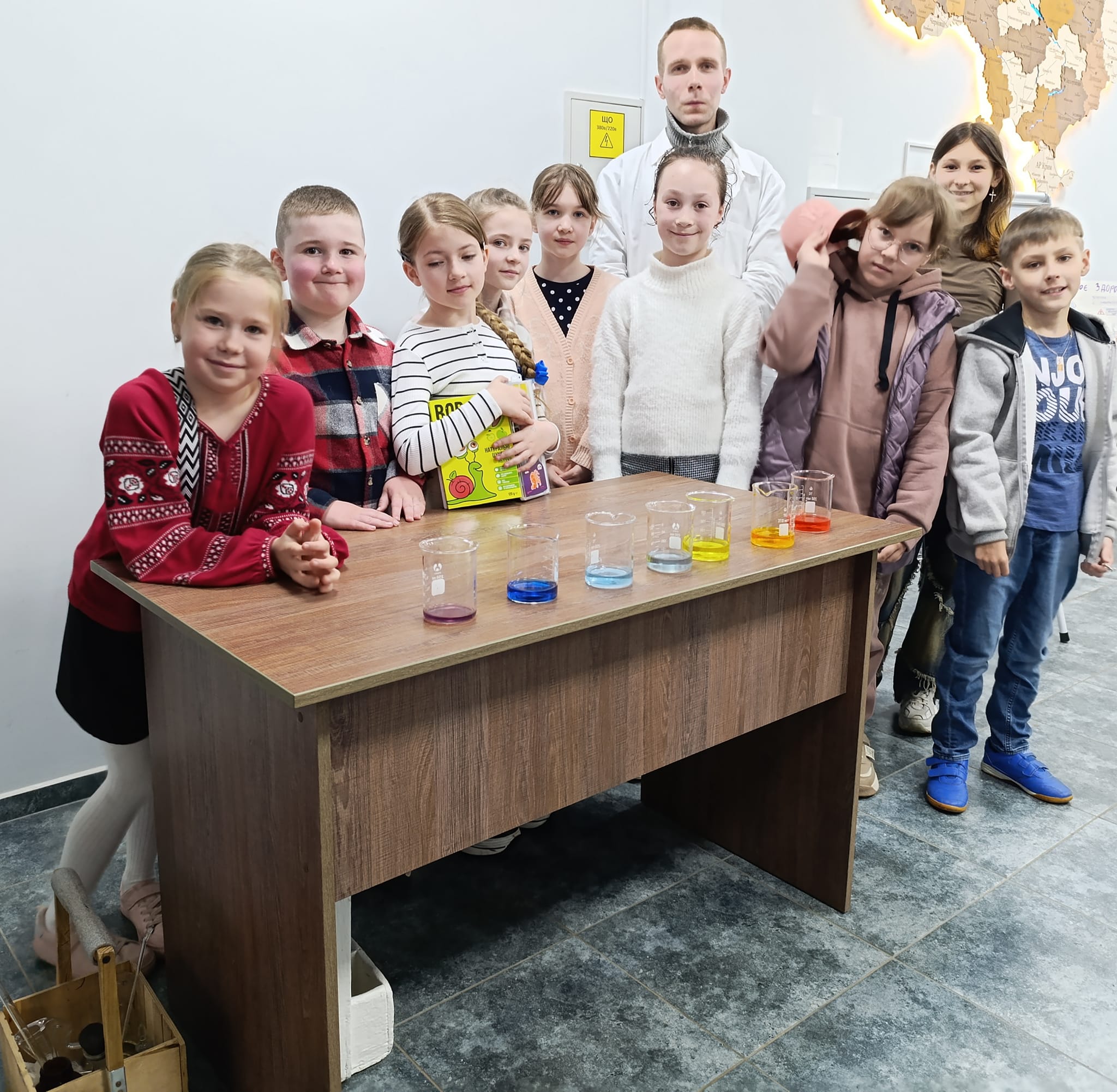 Інженер хімічного аналізу Ілія Подзюбанчук для учасників конкурсу підготував цікаве науково-пізнавальне шоу і продемонстрував досліди «Світлофор у пробірці», «Сухий дим», «Хімічна райдуга».