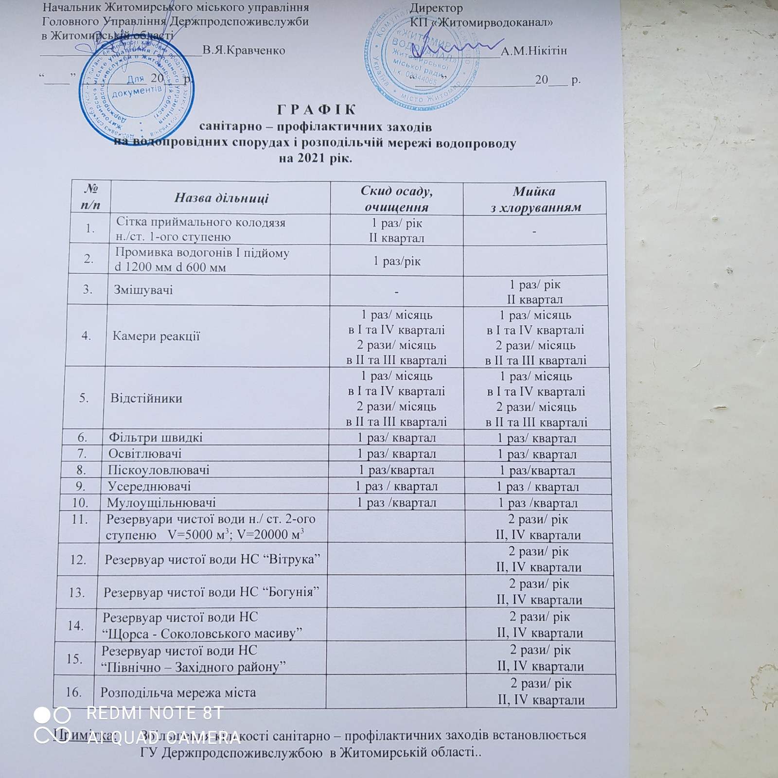 Планова профілактична дезінфекція та промивка міських водопровідних мереж здійснюється двічі на рік (на початку весняно-літнього сезону та на початку осінньо-зимового сезону) на підставі плану, який погоджується з міськвиконкомом і санітарною службою міста.