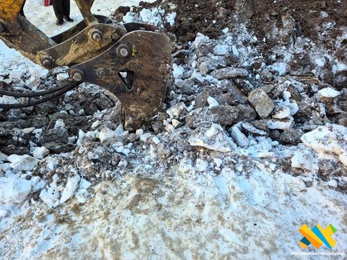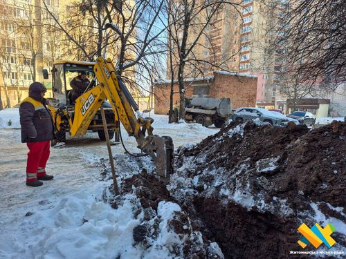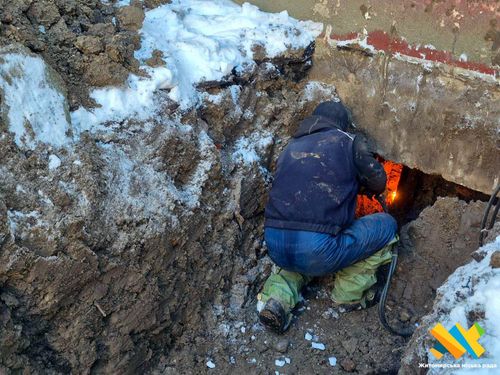 Бачимо, як водій екскаватора забезпечує доступ до місця пориву, пробиваючи промерзлу землю. Слюсар готує все необхідне для монтажу. Ще двоє ось-ось спустяться в холодну траншею, щоб почати з’єднувати нову ділянку. Зварювальник з’єднуватиме трубу з тією, що виходить з підвалу.