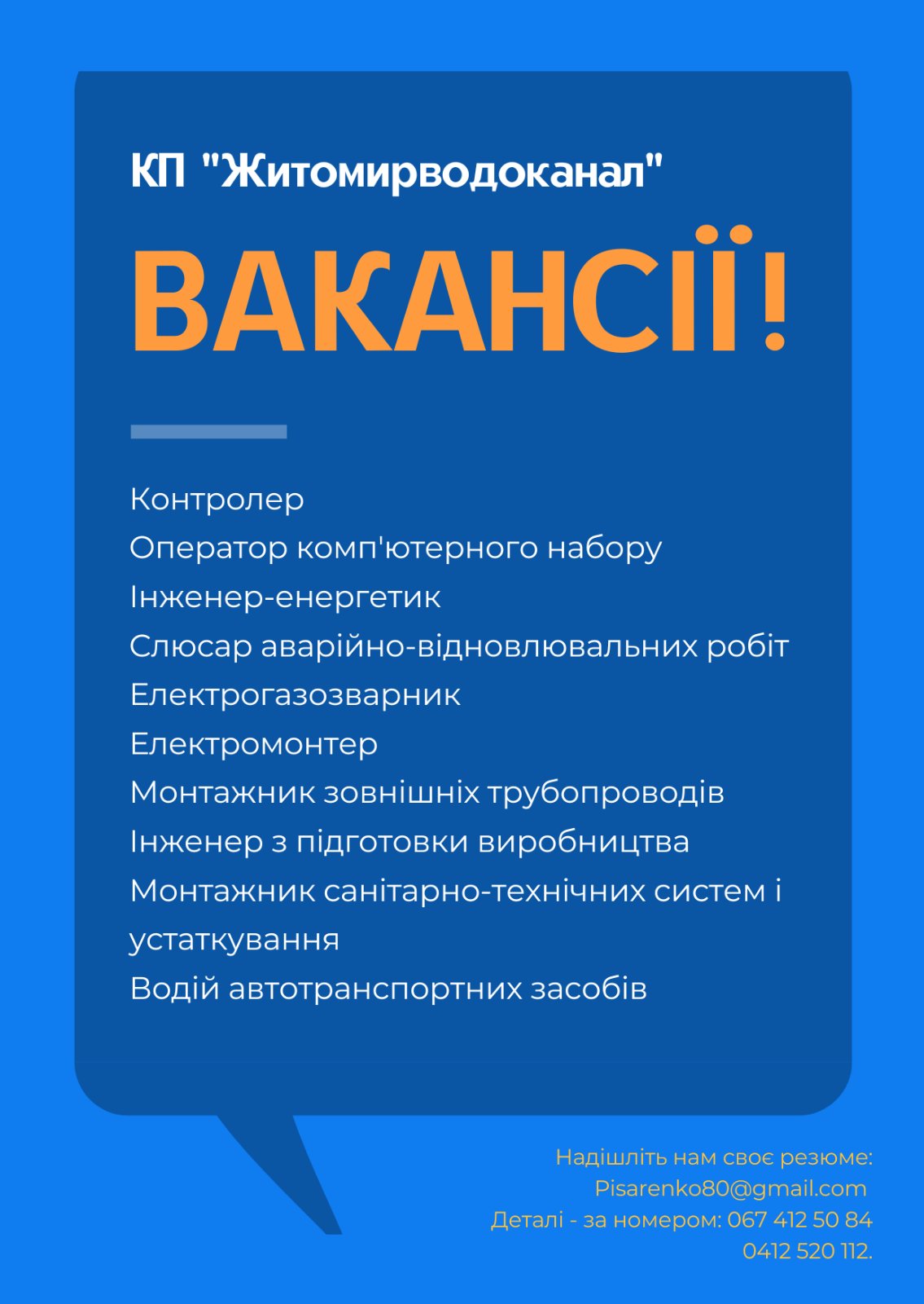 КП "Житомирводоканал" запрошує на роботу фахівців різних спеціальностей: