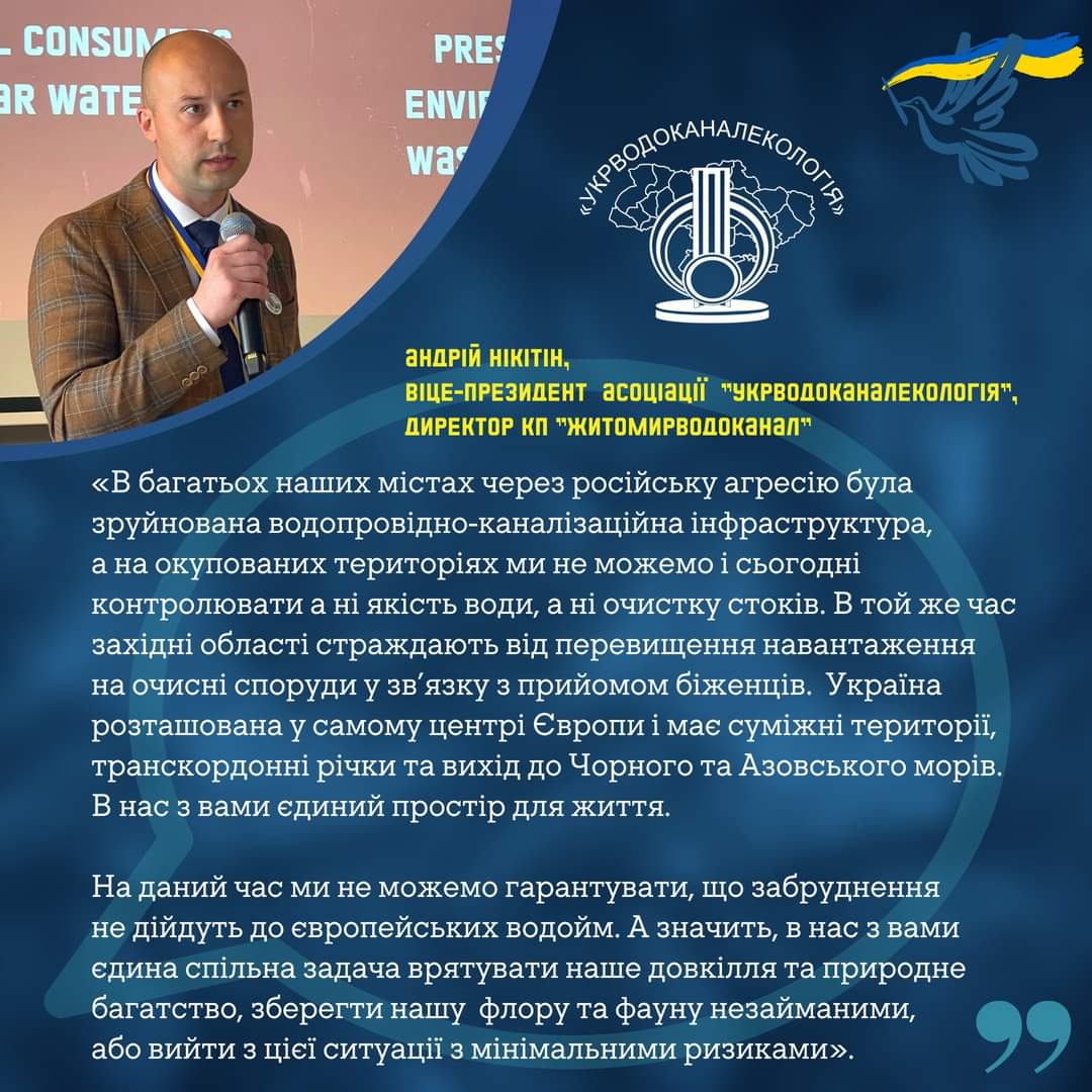 “Наша Асоціація «Укрводоканалекологія» вдячні вам за підтримку нашої країни, і ми маємо надію, що разом ми відновимо права українців на достатню кількість питної води в нашому цивілізованому суспільстві, як це було проголошено на міжнародній конференції ООН, ще 45 років назад та врятуємо наш спільний життєвий простір від екологічної катастрофи”.
