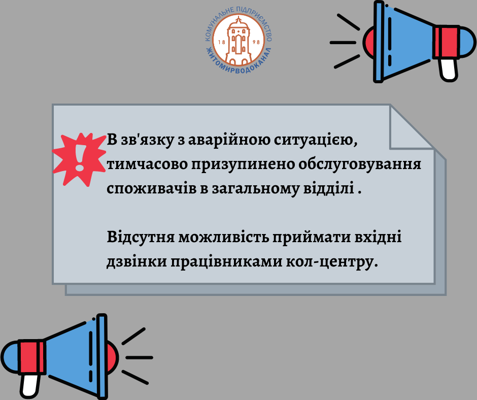 В зв'язку з відсутністю електропостачання в адміністративному корпусі КП "Житомиродоканал" за адресою: вул. Чуднівська, 120, тимчасово призупинено обслуговування споживачів в загальному відділі. Також відсутня можливість приймати вхідні дзвінки працівниками кол - центру.