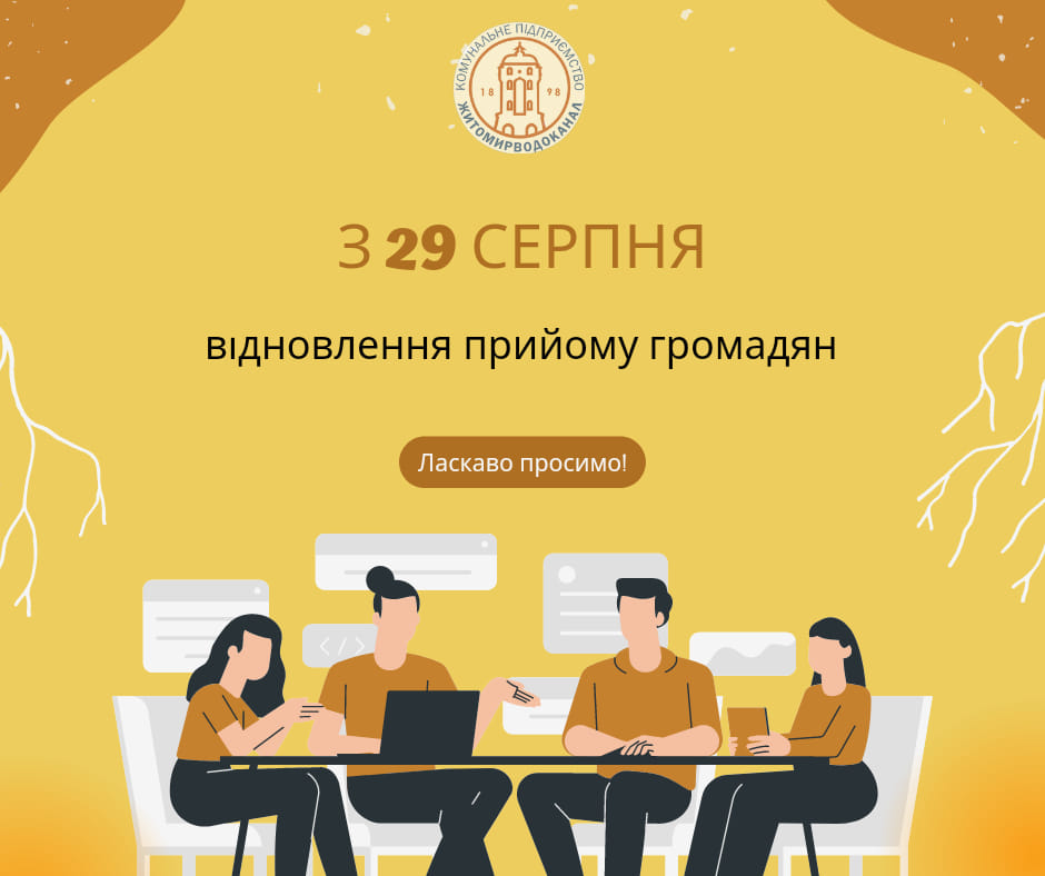 З 29 серпня КП "Житомирводоканал" відновлює особистий прийом абонентів і повертається до звичайного графіку роботи. Проте нагадуємо вам, що більшість запитань, які вас турбують, ви можете вирішити дистанційно. Щоб отримати консультацію - телефонуйте на номер: 0 800 752 553 (у будні з 8:00 до 17:00).