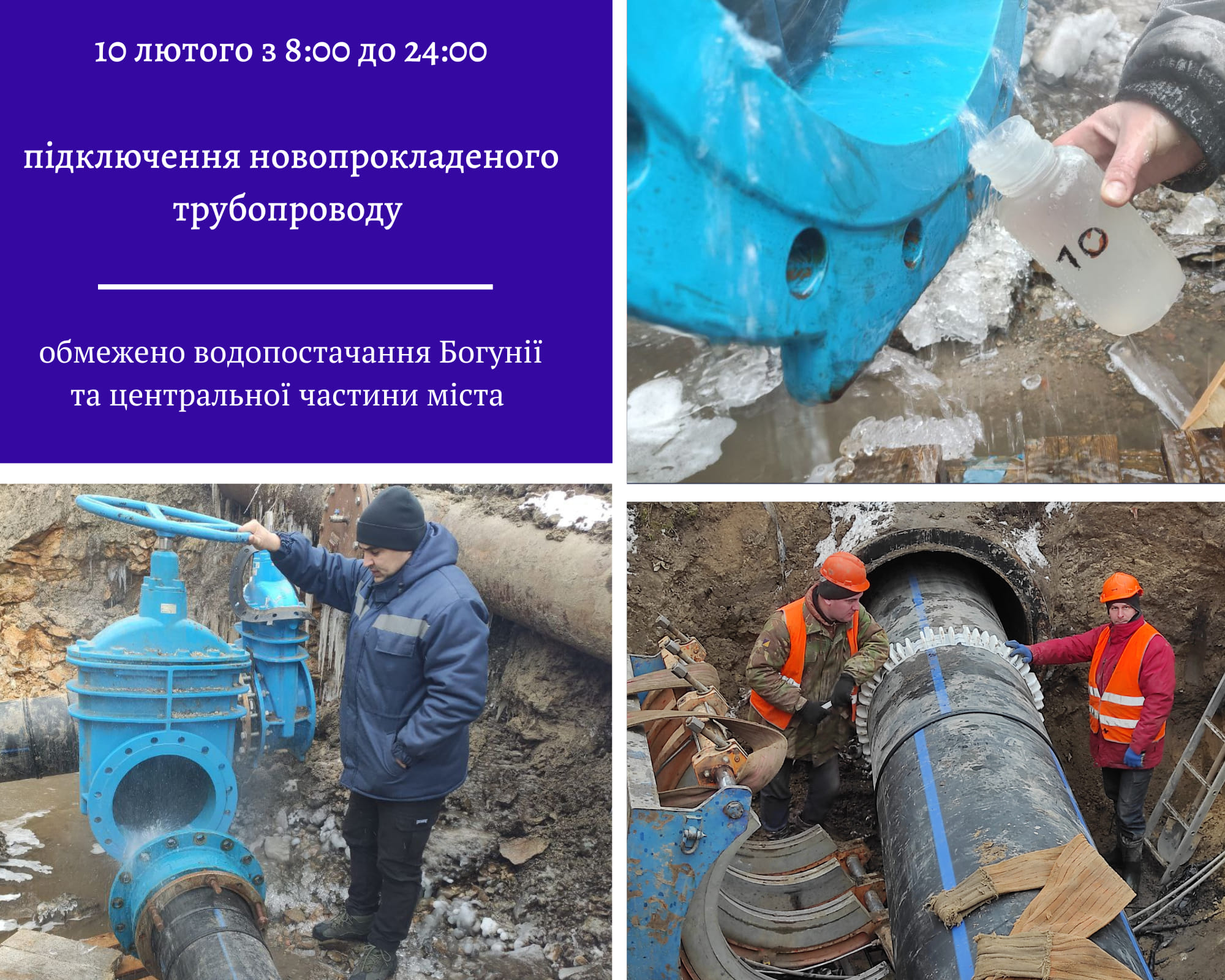 Протягом цього часу буде обмежене водопостачання центральної частини міста (водою будуть забезпечені лише мешканці, які проживають на нижніх поверхах) та мікрорайону Богунія.