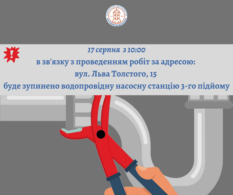 17 серпня з 10:00 в зв’язку з проведенням робіт за адресою: вул. Льва Толстого, 15 буде зупинено водопровідну насосну станцію 3-го підйому, внаслідок чого буде обмежено водопостачання за такими адресами: